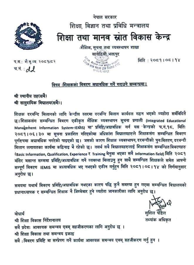IEMIS प्रणालीमा शिक्षक कर्मचारीको विवरण भर्ने बारे अनिवार्य सूचना